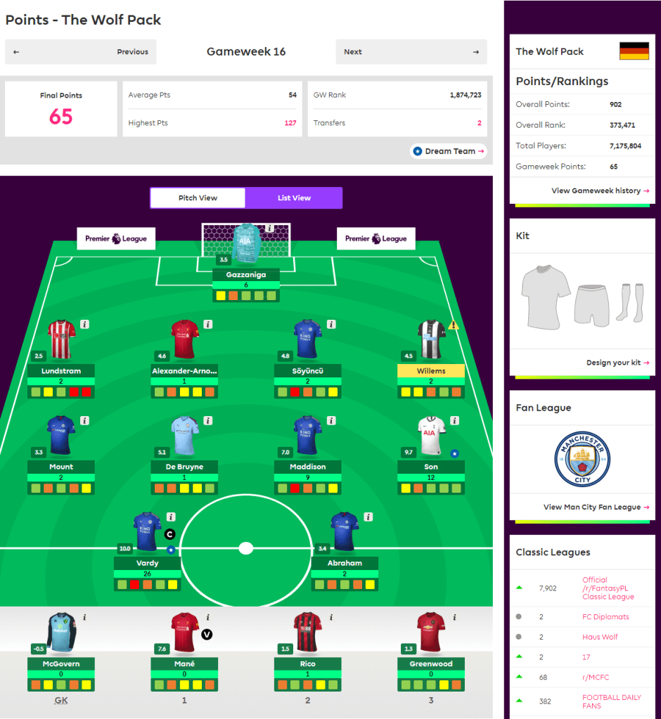 Another great transfer, since the outgoing Jimenez scored 5, leaving me with a net score of -16 from my moves this week. Like I said, Chelsea are in a state, and Tammy is the only one worth keeping in my opinion. Let’s hope he does some damage to the shambolic Cherries backline.