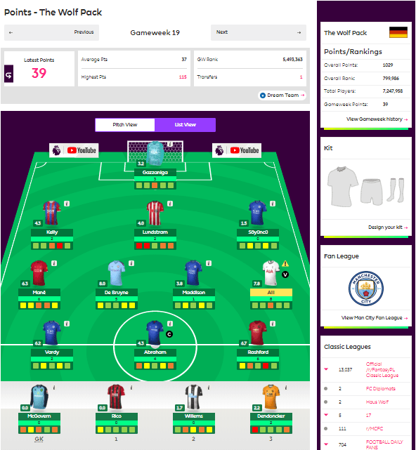I am at a loss for words. I am broken. I am now numb. I’m detaching myself emotionally from these results because they are just spoiling my day. This week I had a nightmare, plummeting another 199k ranks to 799,986 and to dead last in my mini leagues with 39 points all out. I’ll briefly team all my players a new one.