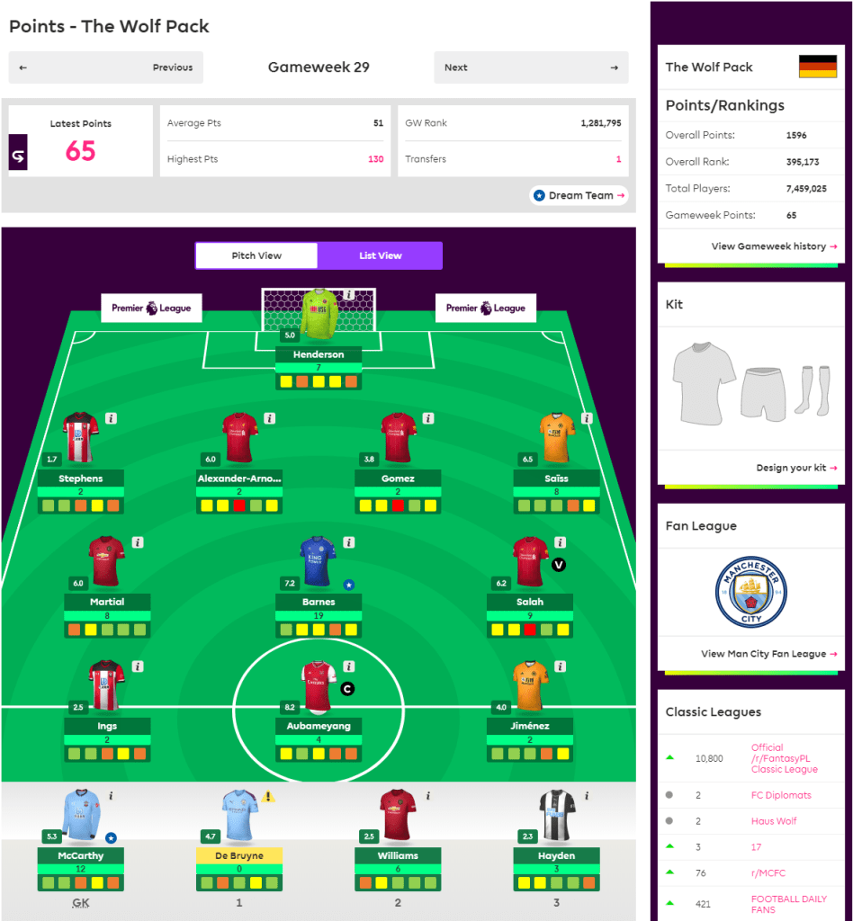 I see trees of green! There was a point this week was looking like another stinker, but my hero Harvey pulled off a 19 pointer and saved my gameweek! The double gameweek being cancelled and Vardy hauling the week I took him out really stung, along with the huge amount of points on my bench. All in all, I’m quite happy with 65 points and a 70k green arrow, up to rank 395,173! Just a few more weeks of this and I’ll be pushing my 100k goal. Let’s take a look at how this was possible.
